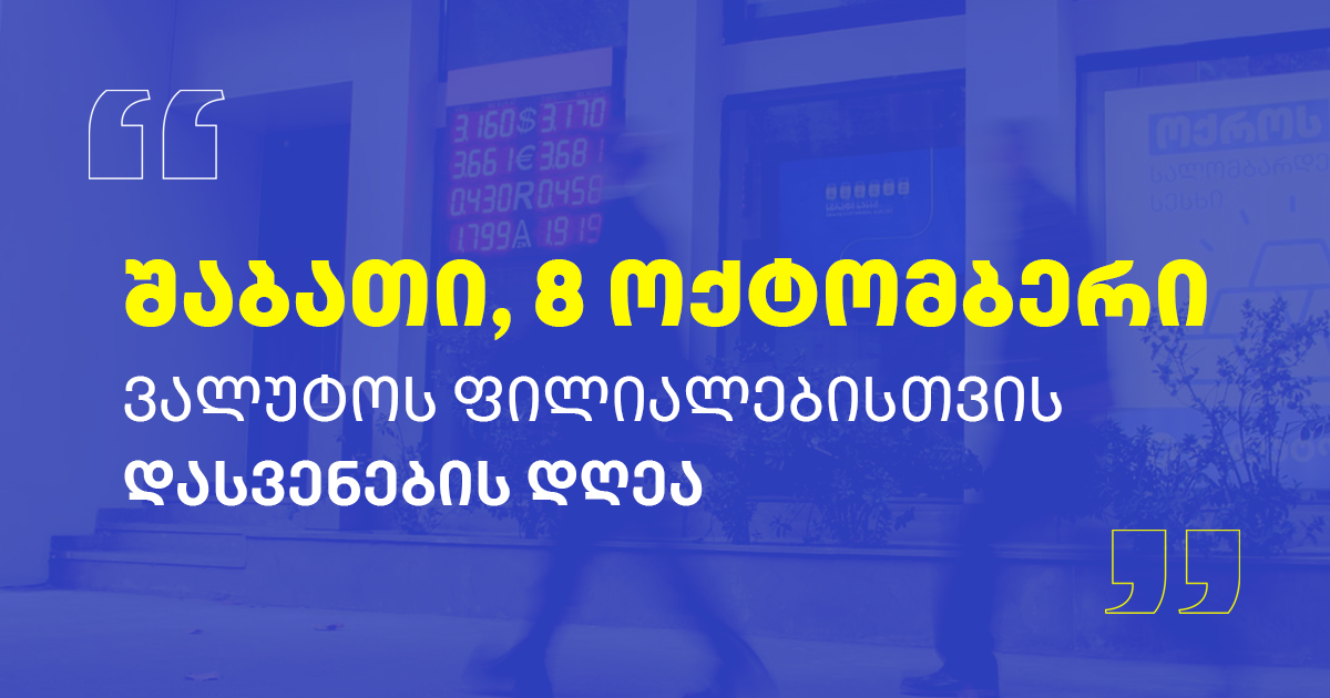 გაცნობებთ, რომ ვალუტოს ფილიალები მთელი საქართველოს მასშტაბით 8 ოქტომბერს, ზოგიერთი კი 8 და 9 ოქტომბერს, წინასწარ დაგეგმილი ღონისძიებების გამო, არ იმუშავებენ.